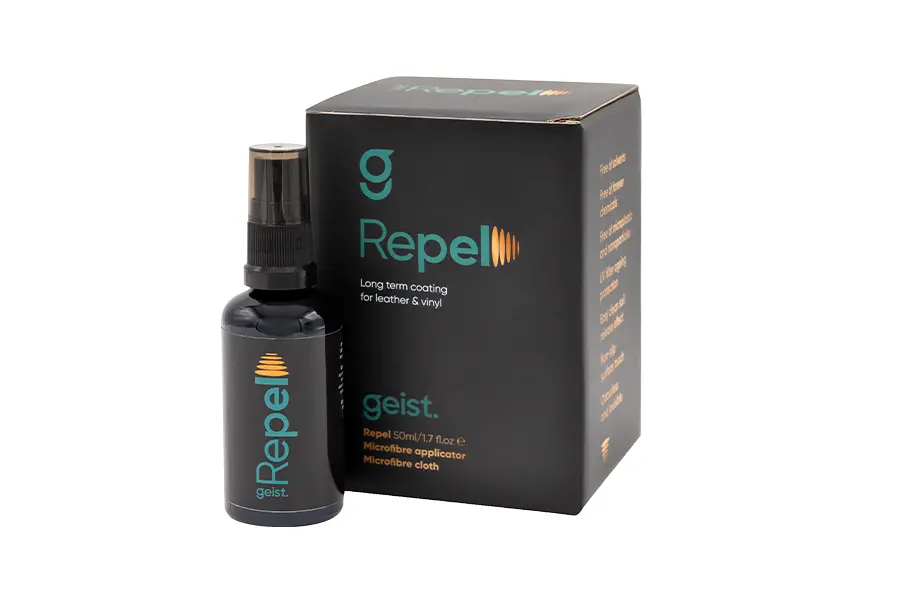 geist(ガイスト)が長年の研究開発の末に開発したレザーシートコーティング「Repel(リペル)」は、ドイツの大手自動車メーカーや皮革メーカーが一堂に会する「自動車内装および品質認識カンファレンス」に参加する化学工業分野の専門家によって、従来のレザーコーティングの性能を遥かに超える最先端のレザーコーティングとして開発されました。この革新的な技術は、極めて薄く、柔軟性と耐久性を高度に両立したコーティング被膜を形成し、同一条件下での比較テストにおいて、ヨーロッパ市場に流通するあらゆるレザーコーティングを大幅に上回る性能を発揮します。