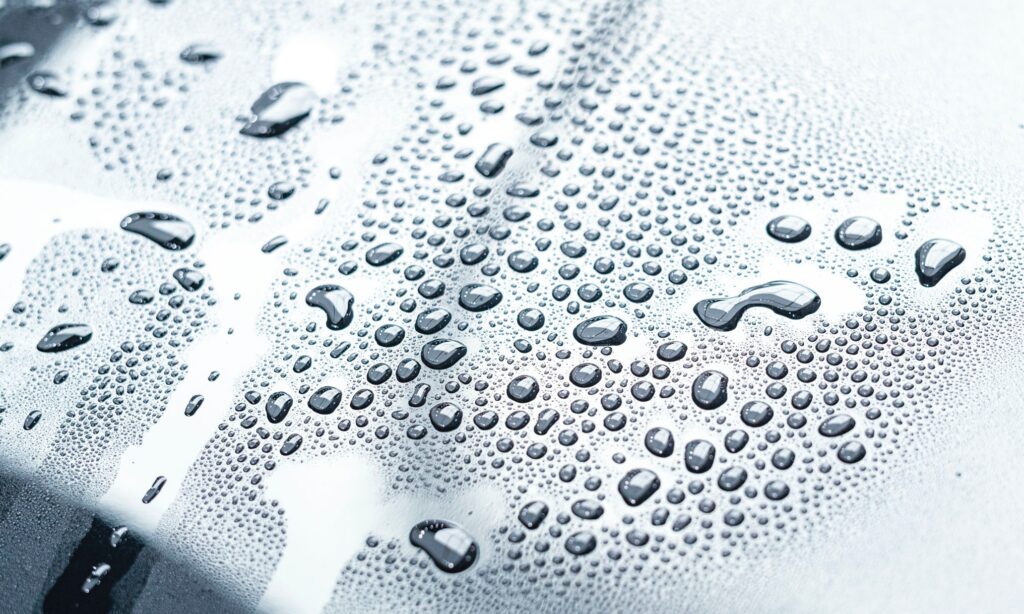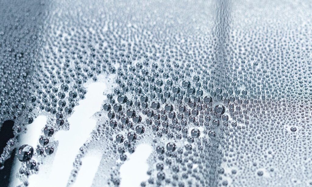 一方でシャンプー洗車の場合は、界面活性剤の洗浄作用によって微細な汚れも浮かせて除去できるため、表面の状態をよりクリーンに保ちやすくなります。またシャンプーには潤滑効果もあるため、洗車時の摩擦が減り、洗車キズの軽減にもつながります。綺麗な水玉が形成されていることが確認できます。