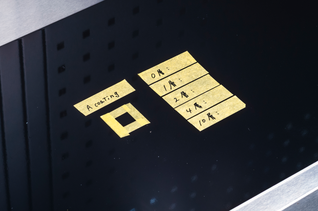 測定の公平性を保つため、同一箇所を測定できるよう塗装面をマスキングで1cm四方に区切り、1層施工ごとに24時間の硬化時間を確保したうえで、塗り重ねと測定を繰り返しています。