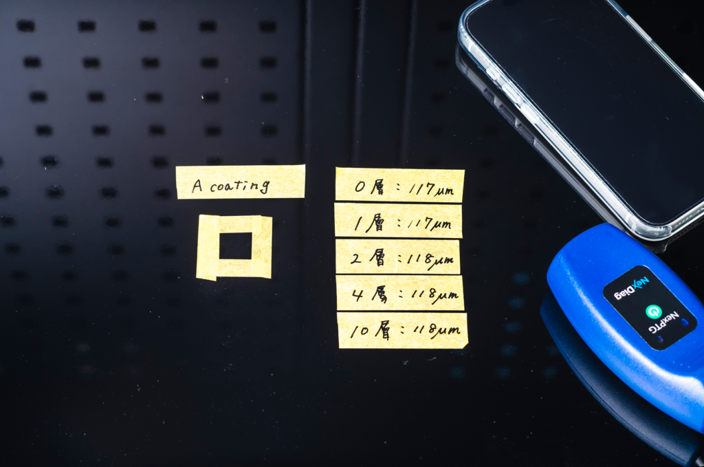 また、複数種類のセラミックコーティングで同様の検証を行っても、測定値に大きな差は見られませんでした。この結果から、少なくとも膜厚という観点では、塗り重ねによって被膜が積層し、数値として明確に厚くなっていくとは言い切れないことが分かります。