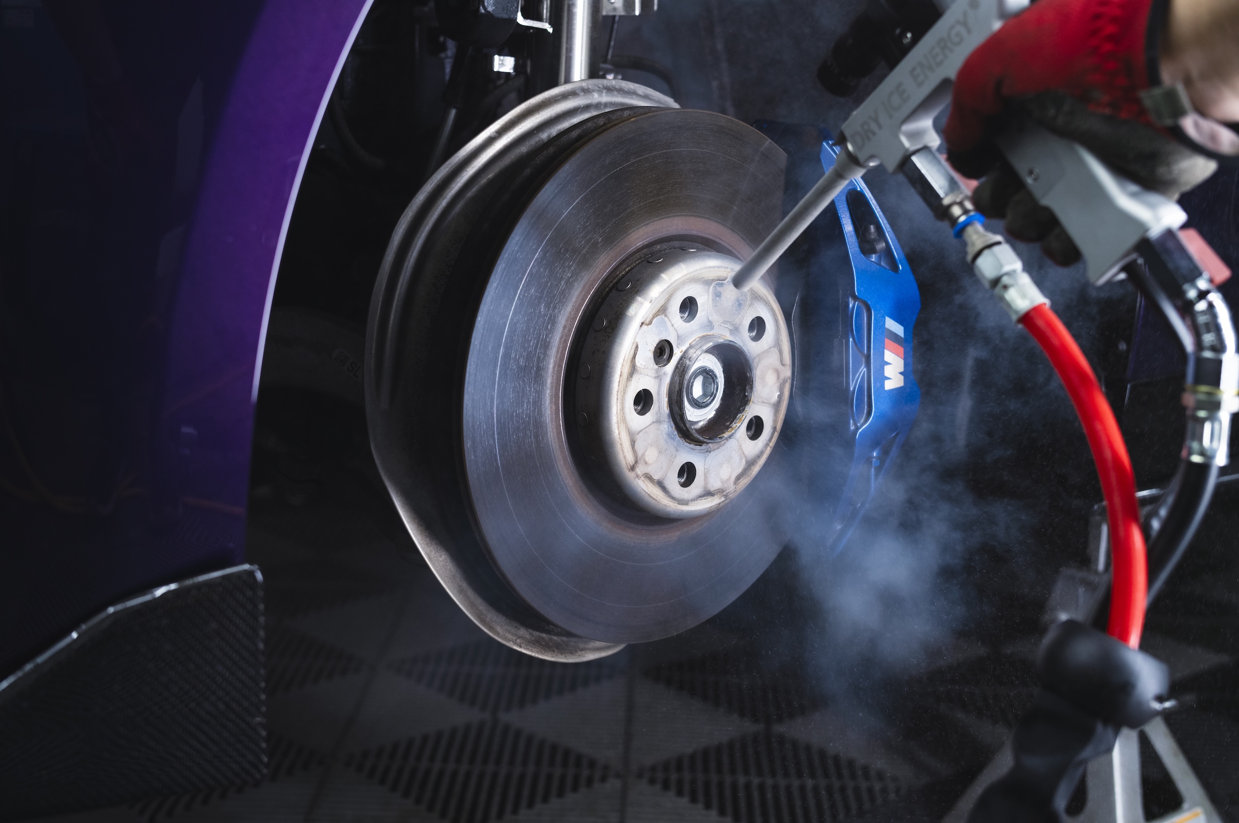 象徴的な変化のひとつが、プレミアムホイールコーティングの充実である。従来は洗浄に時間と神経を使っていたブレーキローター周辺も、ドライアイス洗浄機によってストレスなく対応できるようになった。スリットローターやドリルドローターの穴内部まで、触れることなく確実に汚れを除去できるため、仕上がりの均一性と作業効率が大きく向上している。